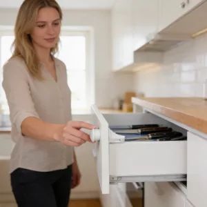 Our one-year-old used to pull out pots and glass bowls. After adding these locks, cabinets stay closed, and the kitchen still looks normal from the front.