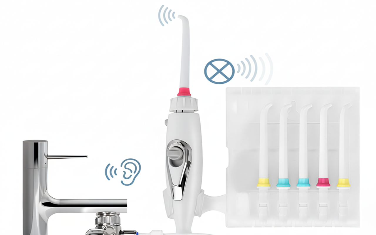 This tap flosser is awesome, especially for my sensitive gums. It feels gentle yet removes all the stuff stuck between my teeth. Quiet and smooth to use.