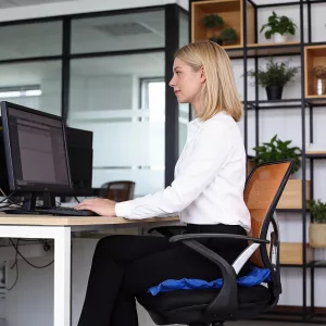 I use this seat at my desk and in the car. It helps with my pain, and the little holes really keep things comfy and sweat-free.