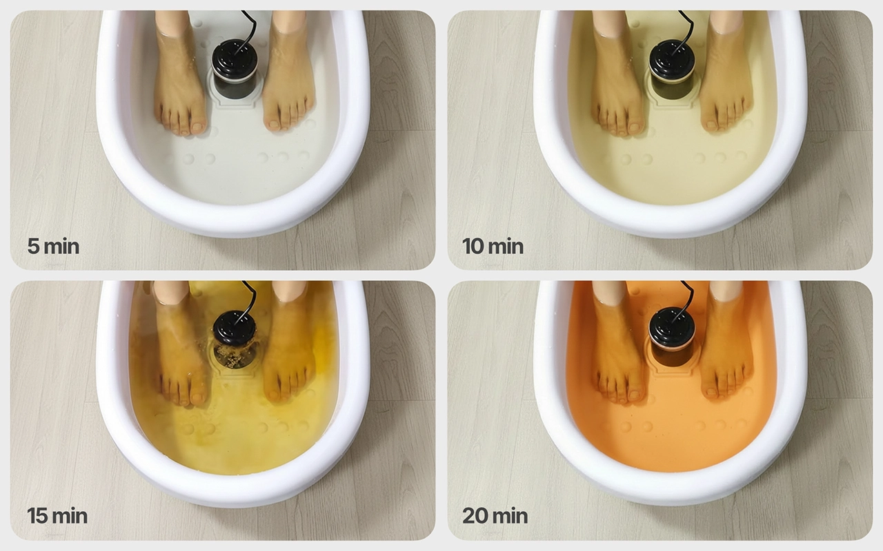 Watch impurities leave as water changes colour under your feet. See heavy metals and waste visibly removed each time.