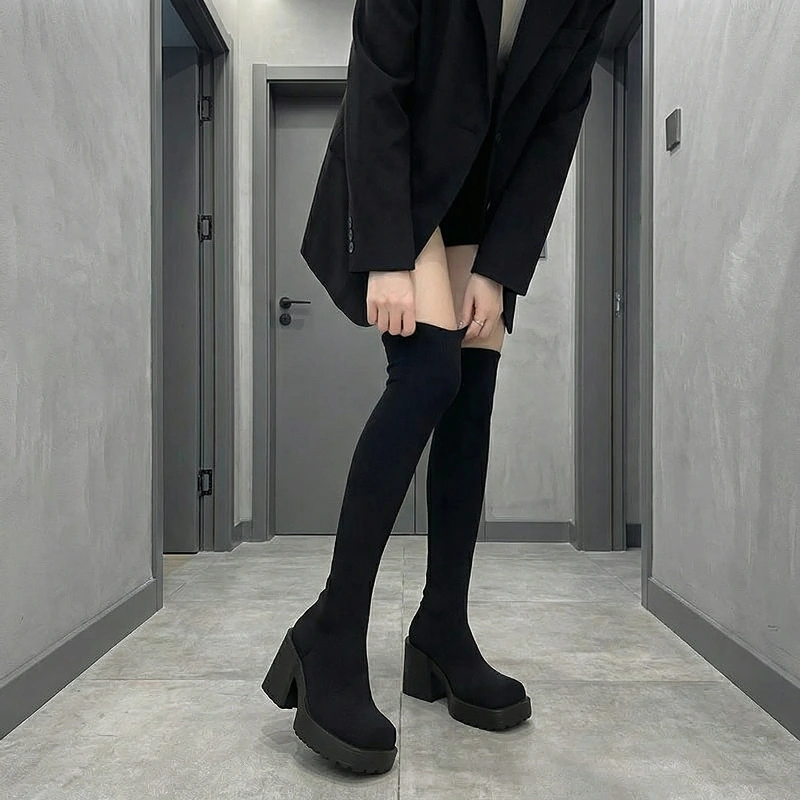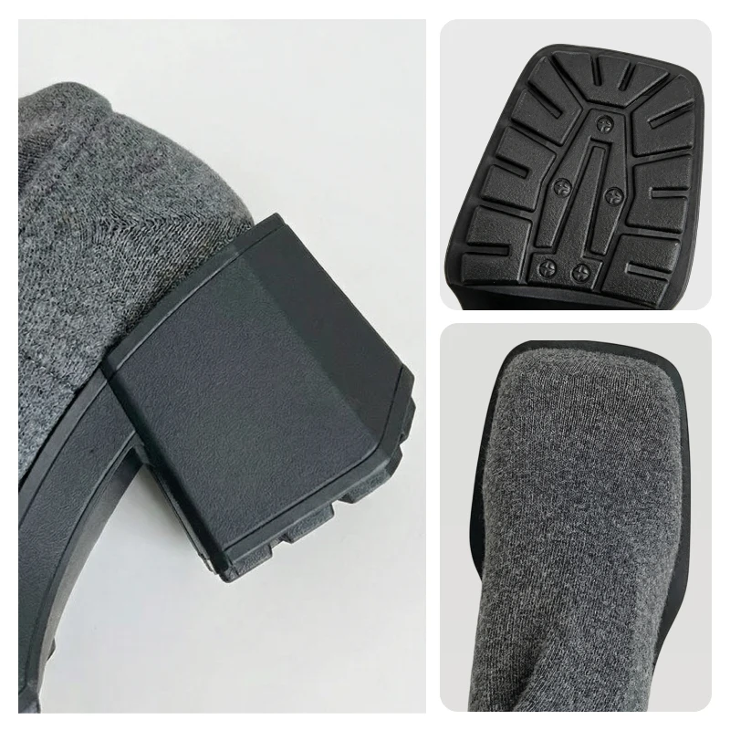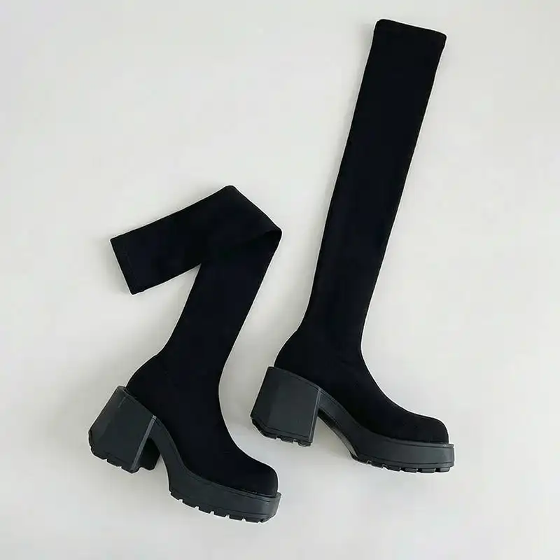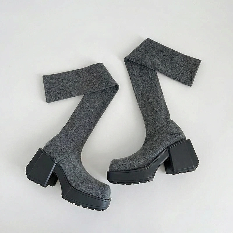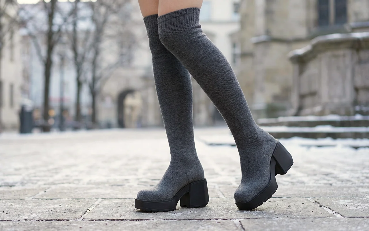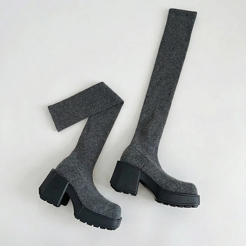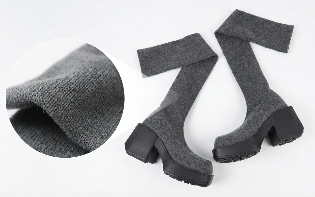 Thick, knitted upper keeps legs and feet warm outside. Chunky platform shields against wet pavements and cold weather.