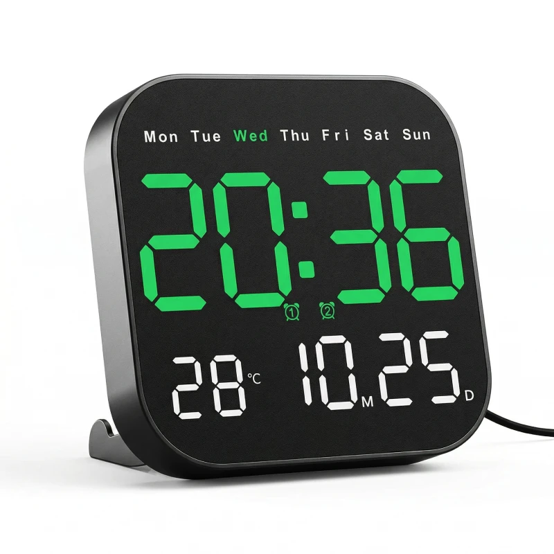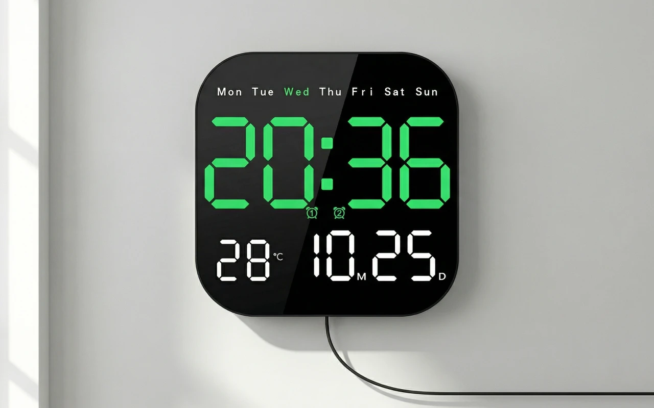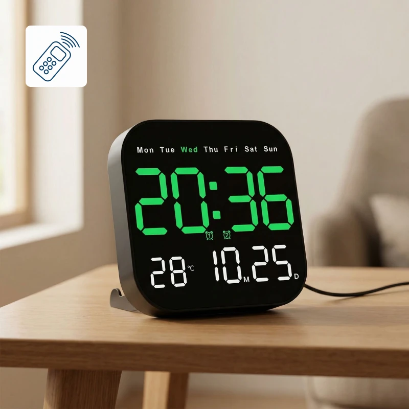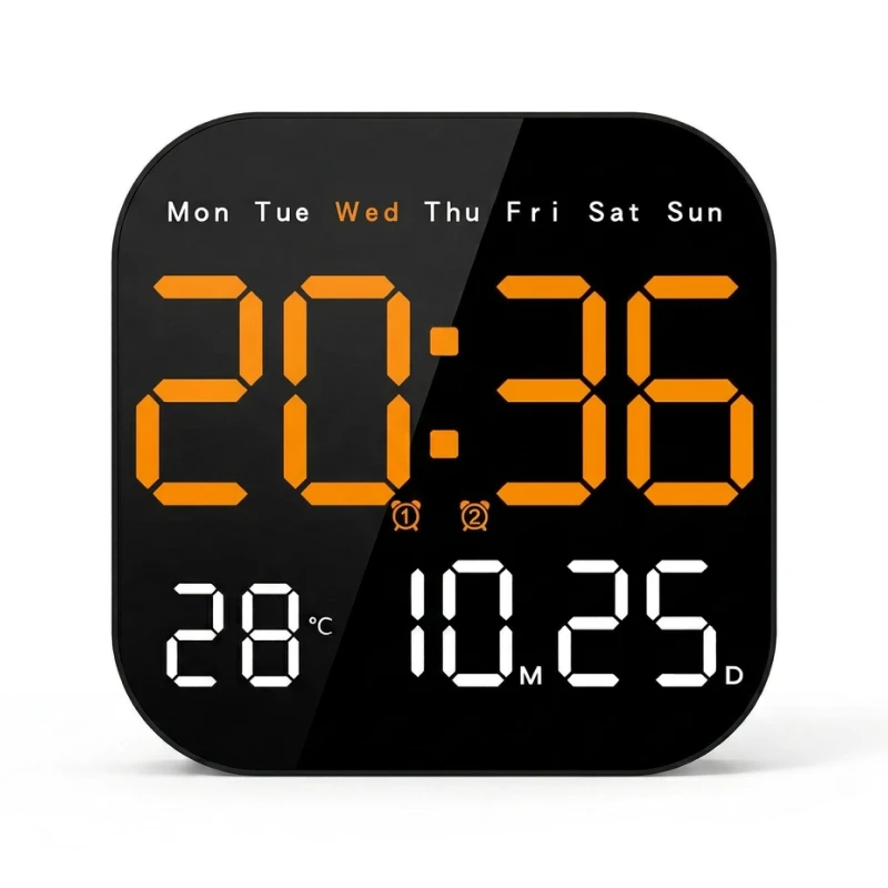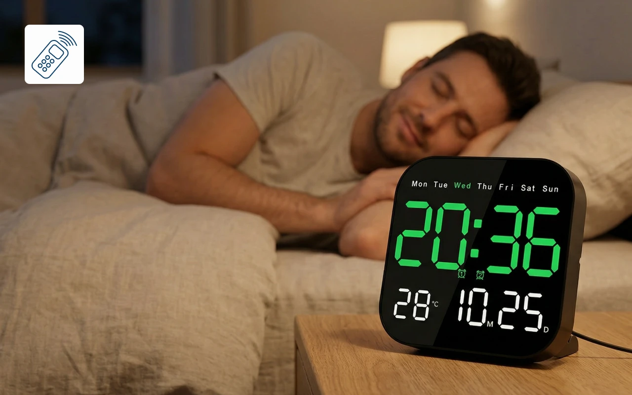 Ortorex Wall Clock keeps routines steady in every room. One screen shows weekday, calendar, and indoor degrees. Change settings from bed using the remote. Ten brightness levels suit naps, films, and mornings.