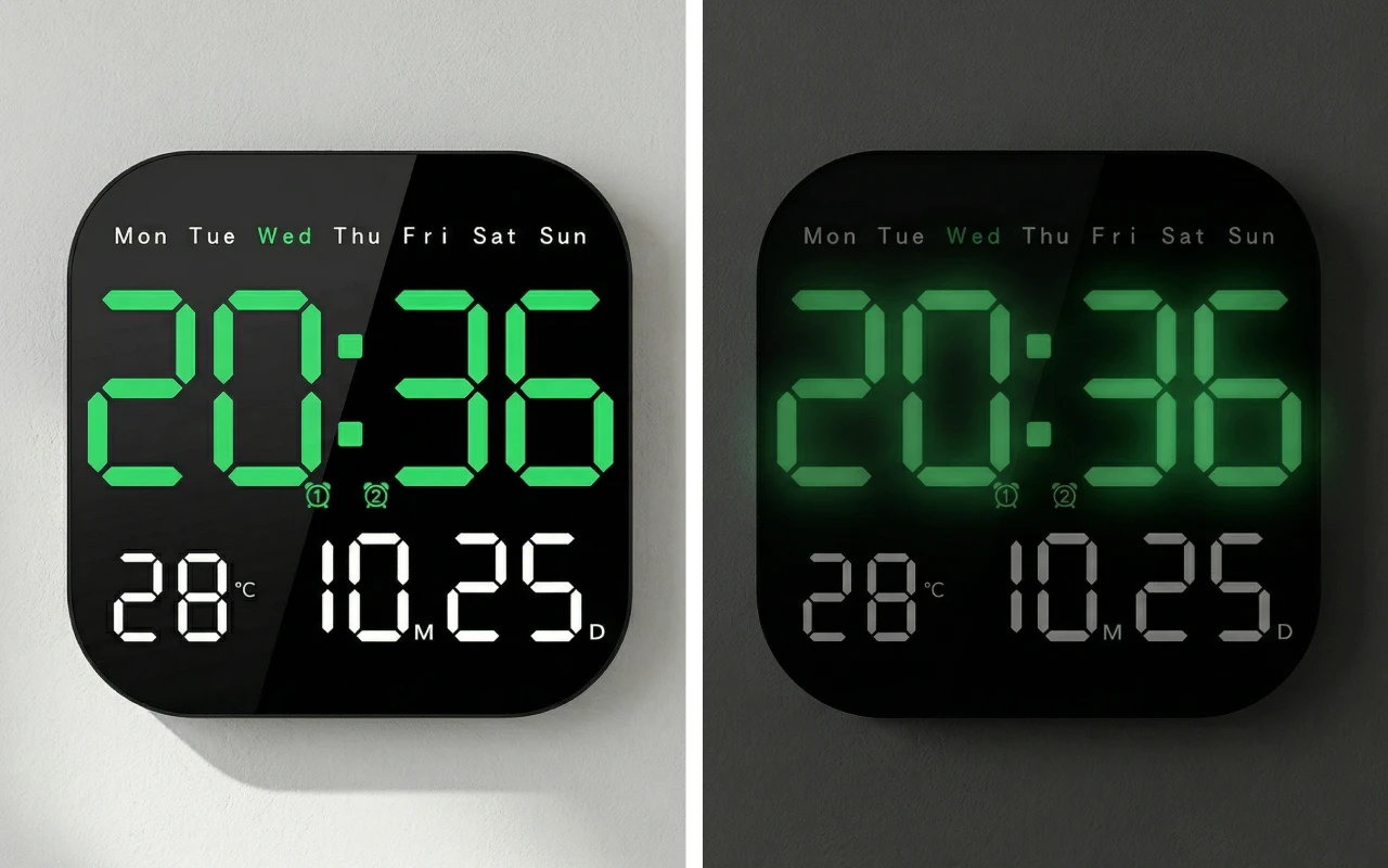 Read numbers fast from across busy spaces. Pick ten light levels for day, evening, or sleep.