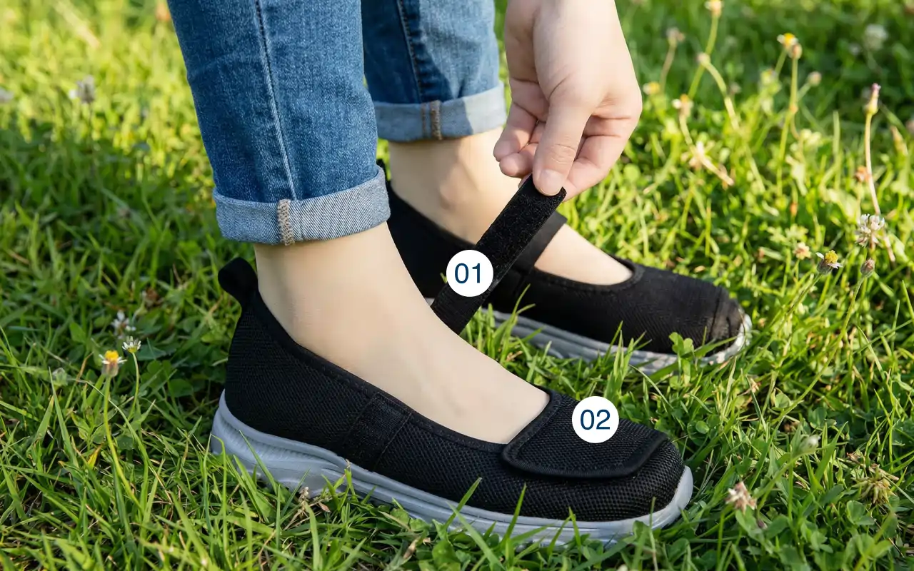 A simple fastening allows quick changes as foot size shifts throughout the day. This helps prevent tightness caused by swelling or sensitivity.