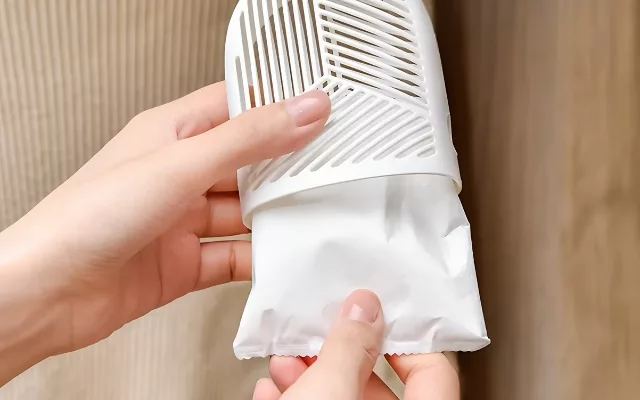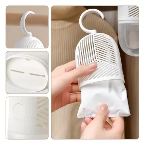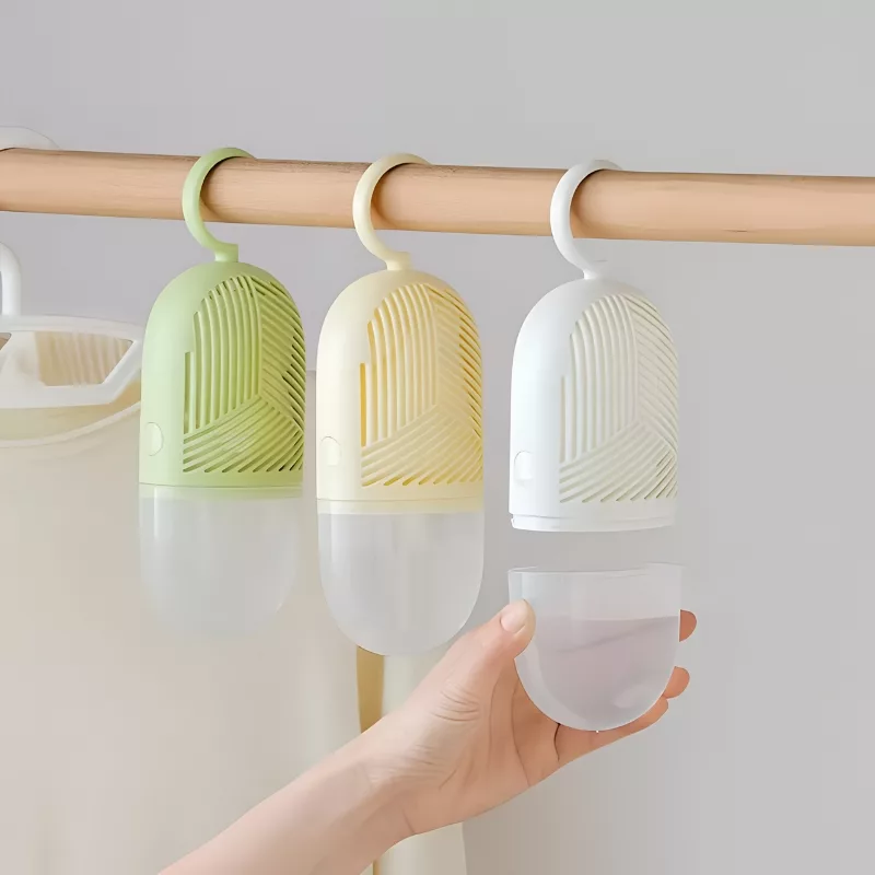 No batteries, plugs, or settings needed. Just put the absorbing bag inside, hang it and forget it.