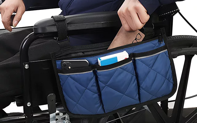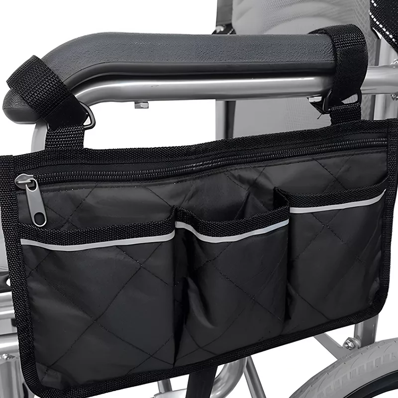 Ortorex wheelchair bag attaches securely and stays in place. Multiple pockets keep items tidy and easy to find. Reflective trim boosts visibility for safety at night.